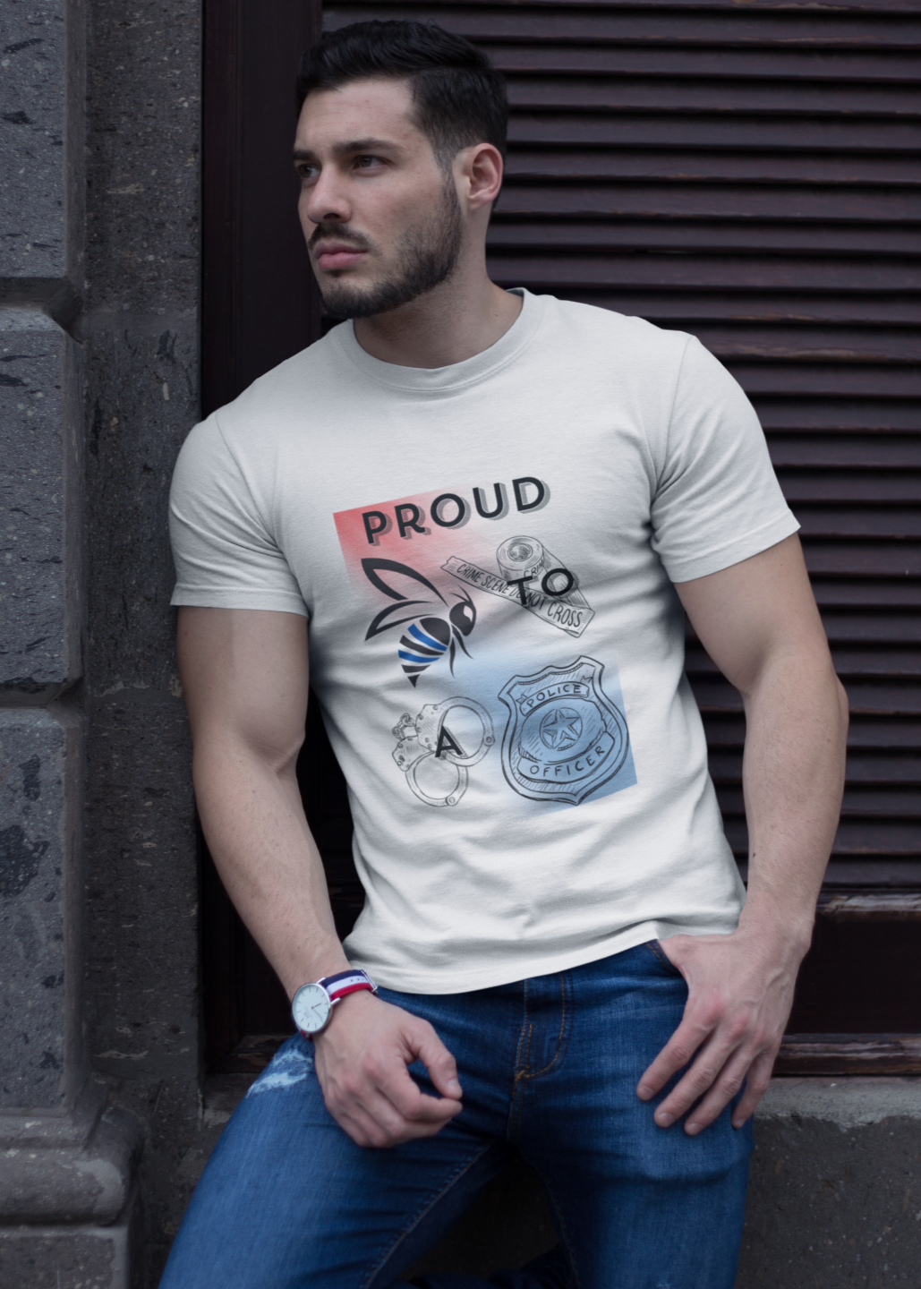 Honor courage, duty, and dedication with this bold “Proud to Bee a Police Officer” design. Featuring a striking bee in black and blue, framed by a police badge, handcuffs, crime scene tape, and a subtle red-blue gradient backdrop—this T-shirt salutes those who serve and protect with unwavering heart.